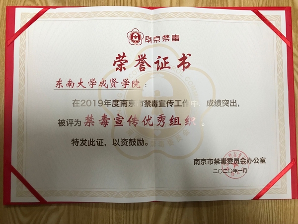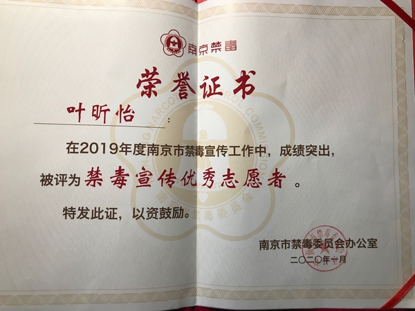 2020年1月5日,2019南京禁毒宣传工作总结会在南京师范大学仙林校区音乐厅召开。省禁毒办常务副主任、省公安厅禁毒总队总队长张波,市局党委委员、市禁毒委副主任曹存福,市禁毒办副主任、市公安局禁毒支队支队长仲军,市教育局宣传与德育工作处处长完进、市公安局禁毒支队副支队长刘庆峰、团市委副调研员陶涛以及各地区高校禁毒志愿者们参加了本次禁毒宣传工作总结表彰会。云鼎国际4118welcome青年志愿者协会因2019年在禁毒宣传工作上表现突出,被评为“禁毒宣传优秀组织”,我校叶昕怡同学被评为“优秀志愿者”。