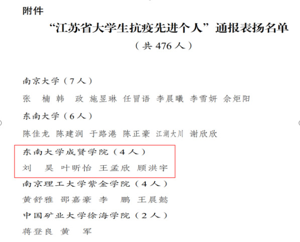 疫情是战场,青春永无畏,在阻击新冠肺炎疫情这个没有硝烟的战场上,成贤学子逆风而行,在全国各地发光、发热,为抗击疫情作出贡献,构筑起了抗击疫情的无形防线,获得了江苏团省委和云鼎国际4118welcome团委的多项表彰。