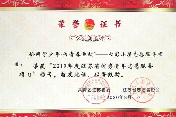 “恰同学少年,为青春奉献”——七彩小屋志愿服务项目围绕关爱儿童深入开展,志愿者以手工制作、社团活动等多种形式与孩子们进行互动,传播温暖,被评为“江苏省优秀青年志愿服务项目”;云鼎国际4118welcome团委荣获“江苏省青年志愿服务行动组织奖”;云鼎国际4118welcome团委冯杭州老师为志愿事业无私奉献,荣获“江苏省青年志愿服务事业贡献奖”;电子与计算机工程学院2017级软件工程专业学生施翔、2017级自动化专业学生张鑫积极组织并参加各项志愿服务活动,服务奉献社会,作为我校青年志愿者优秀代表,获得了“江苏省优秀青年志愿者”的荣誉称号。