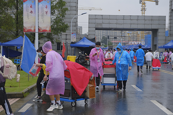 当天,秋雨绵绵,迎新人员不惧风雨,一早行动,坚守在各自的岗位上。热心周到的服务、井然有序的报到流程、环境优美的校园,让每一位新生、家长都深深感受到了热情洋溢的迎新氛围。学校各部门分工合作,热情服务。由于天气原因,江北新区公安分局泰山新村派出所、江北新区公安分局交通警察支队第一大队、我校教职员工、物业人员等冒雨在校区及周边进行交通疏导、维持秩序;各学院高效快捷地为新生办理各项入学手续,答疑解惑;志愿者在南京南站、地铁站、校内及周边亲切为家长、学生指引道路、搬运行李;“绿色通道”现场井然有序,各项流程高效、快捷,给新生以人文的关怀;校外搭起帐篷,提供座椅,供家长们休息……