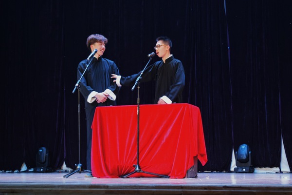 本次演出由话剧团相声组倾情演绎演出包括传统对口相声《幸福是什么》《规矩论》《你压力大吗》《打灯谜》和创新型歌舞剧相声《探清水河》各剧目充分展现了相声生动明快灵活多样的艺术特点其语言通俗易懂,内容丰富多彩。演员们的表演形式牢牢地牵动观众情绪,给喜好相声的师生提供了视觉、听觉的双重体验。