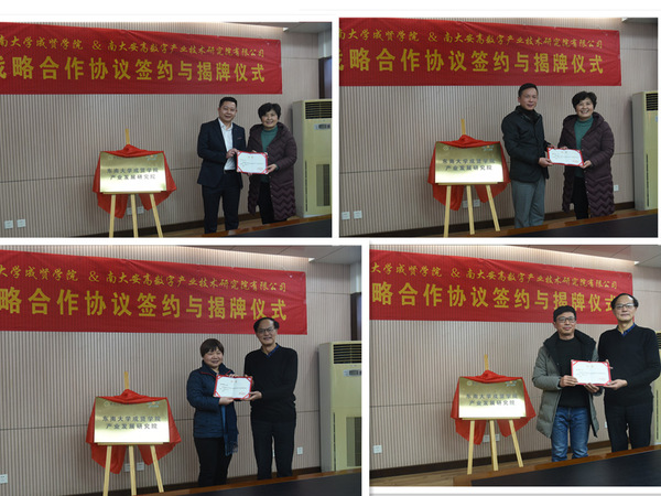 1月13日下午,云鼎国际4118welcome与南大安高数字产业技术研究院有限公司战略合作协议签约与揭牌仪式在我校真知馆207会议室顺利举行。参加签约及揭牌仪式的嘉宾有南京大学产业党工委委员、南大安高科技集团董事长许志怀先生,南大安高科技集团常务副总裁、数字产业技术研究院院长陆孚生先生、执行院长吴科先生、副院长陆邢先生、培训中心主任李乐女士。云鼎国际4118welcome常务副院长许映秋教授、副院长董梅芳教授、发展合作处处长胡焱教授、教务处副处长陈雪琼,经管学院院长戚啸艳、党总支副书记李清源、副院长孙亮和高凯丽、综合办主任程希羲出席活动。仪式由经管学院院长戚啸艳教授主持。