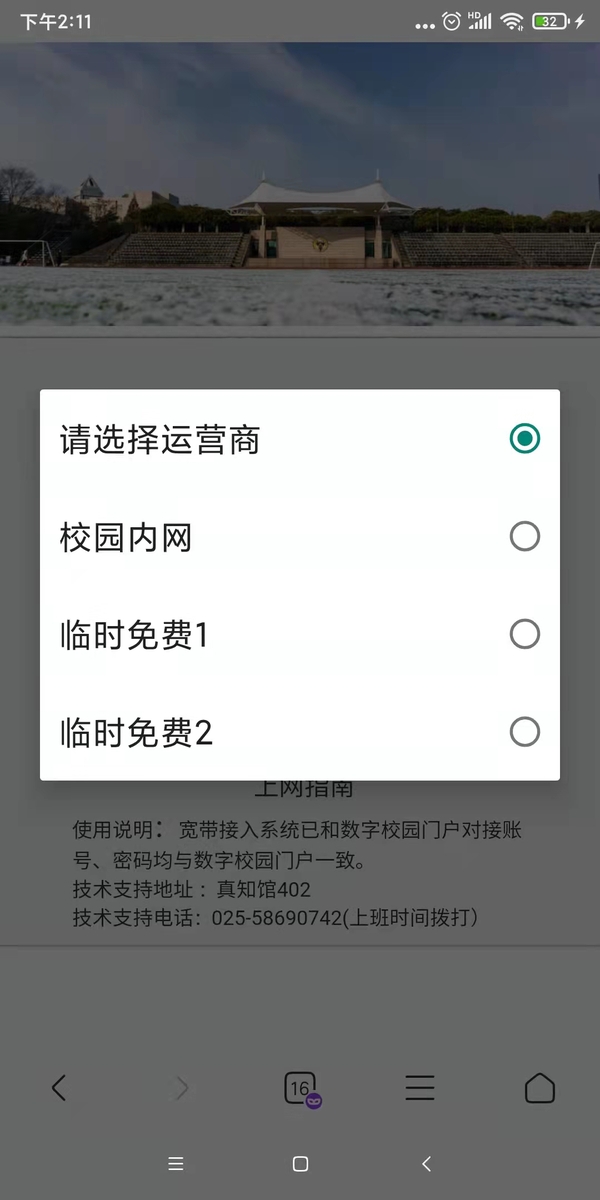 3.弹出认证页面,选择下拉菜单中的“临时免费1”或“临时免费2”选项,使用数字校园门户的用户名和密码登陆即可免费连接外网。