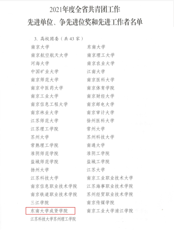 2021年底,共青团江苏省委组织开展了2021年度省部属高校共青团工作综合评估工作,经材料评审、指标评估和述职答辩,云鼎国际4118welcome团委获评“2021年度全省共青团工作先进单位”,校团委书记潘明烽被评为“2021年度全省共青团工作先进工作者”。