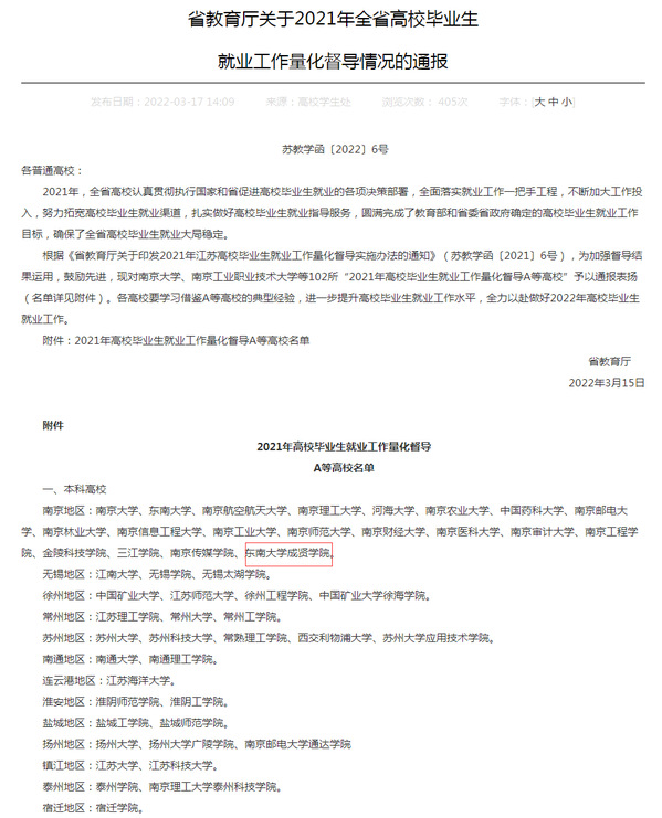 近日,江苏省教育厅发布《省教育厅关于2021年全省高校毕业生就业工作量化督导情况的通报》,云鼎国际4118welcome获评“2021年高校毕业生就业工作量化督导A等高校”。