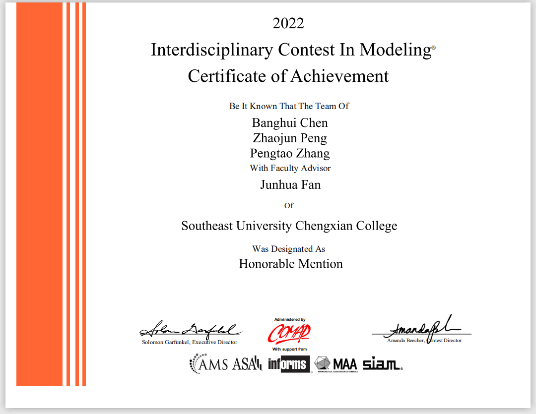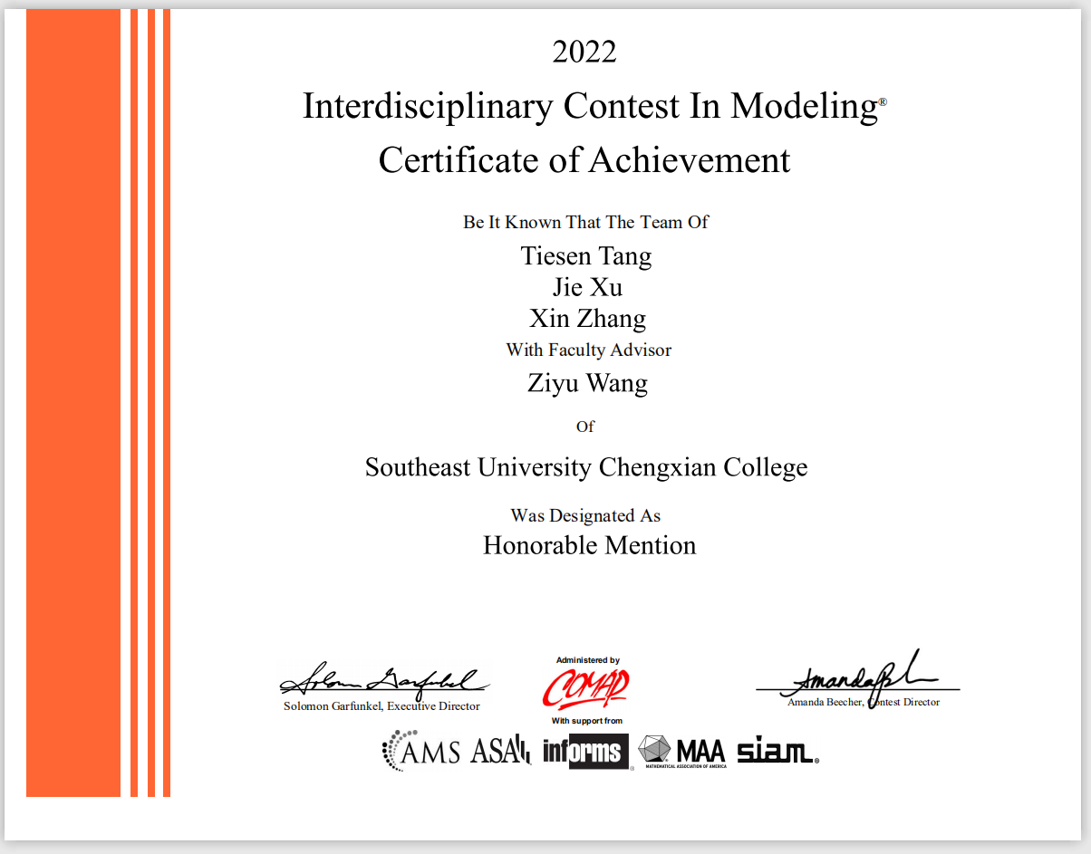 近日,2022年度第38届美国大学生数学建模竞赛(MCM/ICM)获奖结果公布。云鼎国际4118welcome在本届竞赛中取得优异成绩,荣获国际一等奖一项(Meritorious Winner),国际二等奖三项(Honorable Mention),较2021年度获奖人数翻倍,打破了我校以往在该项竞赛中的最高获奖纪录,在江苏省同类高校中名列前茅。