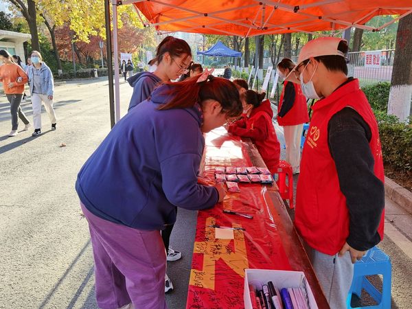 活动当日,食堂主干道悬挂了主题横幅、以喷绘、展板、橱窗方式进行艾滋病防治知识的宣传;校团委红十会学生分会化身防艾宣传志愿者派发宣传册,向同学们介绍艾滋病的危害与相关防范知识;同学们在防艾宣传板上留下自己的姓名和祝福,以一条条现场自制的红丝带来表达自己对艾滋病群体的关怀与善意;现场还进行了有奖知识问答、医护咨询、“爱的抱抱”等活动,参与现场活动即可领取一份防艾宣传单页、红丝带徽章、艾滋病检测试剂、安全套及帆布包,小小的礼品承载着我们对艾滋病防治事业的决心,与大家一起合力共创无“艾”未来的美好期望。活动现场同学们积极参与,气氛活跃。