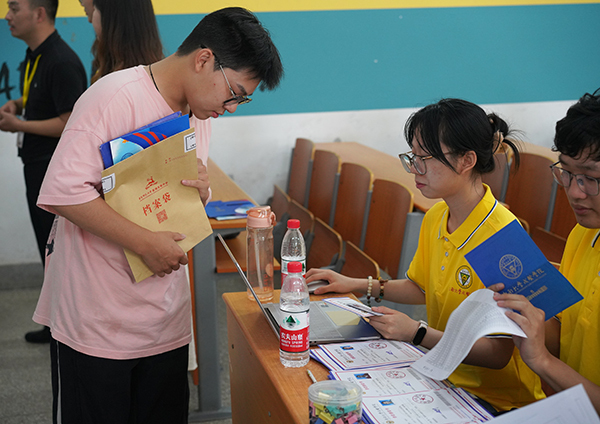 学校领导现场了解学生报到情况并与家长亲切攀谈