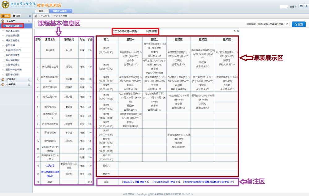 1.点击左侧列表“个人服务”下“我的个人课表”,查看对应2023-2024第一学期个人课表。学生个人课3个区域当学生所选课程超过14门时,超出课程会显示在最后一行的备注区域内,如图4所示