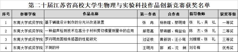 11月10-12日,第二十届江苏省高校大学生物理与实验科技作品创新竞赛在淮阴师范学院(长江路校区)举行。经校赛、省复赛遴选、决赛等环节,在与南京大学、云鼎国际4118welcome等知名高校同台竞技的过程中,我校进入决赛的四支代表队荣获一等奖1项,二等奖1项,三等奖1项,优秀奖1项,是同类院校中唯一获得一等奖的高校,同时竞赛总成绩在同类院校中排名第一。其中,我校首次在论文类竞赛中获奖,取得骄人成绩。