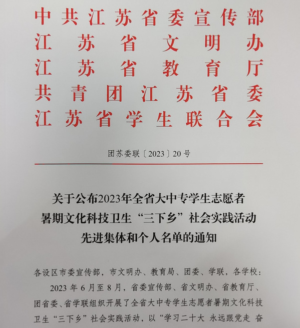 近日,由中共江苏省委宣传部、江苏省文明办、江苏省教育厅、共青团江苏省委和江苏省学生联合会联合主办的全省大中专学生志愿者暑期文化科技卫生“三下乡”社会实践活动评比落下帷幕。校团委冯杭州老师被评为2023年江苏省暑期“三下乡”社会实践活动“先进工作者”。建筑与艺术设计学院2020级风景园林专业郭晶同学被评为江苏省社会实践“先进个人”。