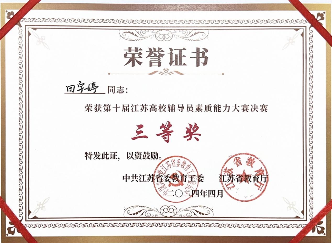4月19日至20日,由江苏省委教育工委、江苏省教育厅主办的第十届江苏高校辅导员素质能力大赛决赛在南京医科大学举行,来自全省150所高校的150名辅导员经由7个研修基地复赛选拔,最终推选出40位辅导员同台竞技。我校土木与交通工程学院辅导员田宇婷一路披荆斩棘,代表学校以基地复赛一等奖的优异成绩晋级决赛,并荣获决赛三等奖,这是我校首次进入大赛决赛,实现了学校自参加此项赛事以来的历史性突破和最好成绩。