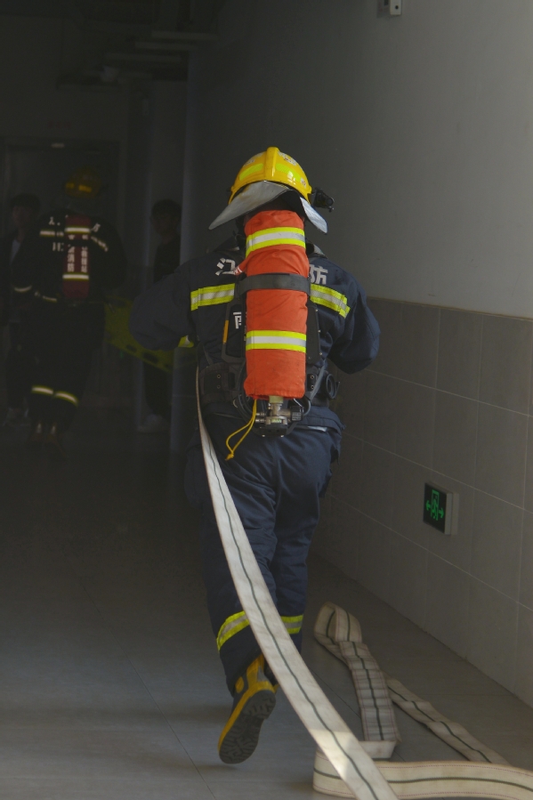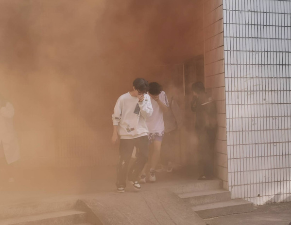 在模拟“火情”的警报鸣响后,工作人员第一时间赶赴现场,引导学生有序疏散至室外平台区域。同时,消防车到达现场,消防员在我校工作人员的协助下完成楼内人员搜索及清点等工作,最终全部人员安全疏散,整场活动井然有序。本次演练在引导疏散的基础上还增加了“固守待援”技能训练,模拟了在突发情况下室内人员无法逃生等待救援的情况,锻炼了相关人员的应急处置和避险能力。