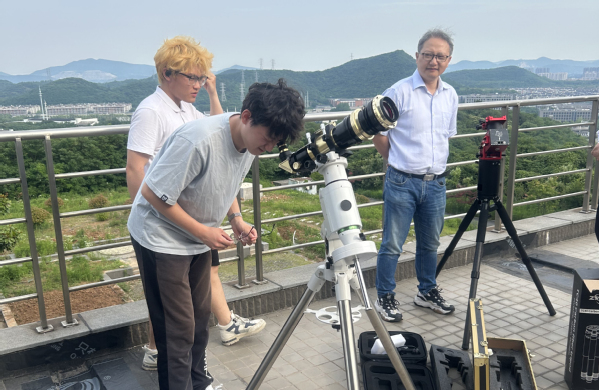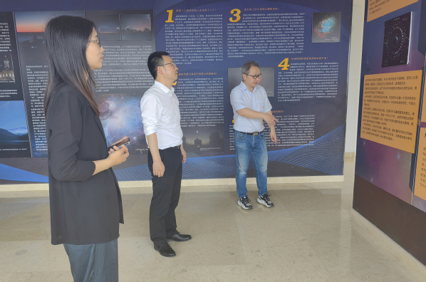 会后,在彭志欣秘书长的带领下,我院师生代表参观了南京大学左涤江天文台。首先进入一楼展厅,彭志欣秘书长科普了地球自转公转带来了月亮的阴晴圆缺、日偏食的形成、彗星产生的彗尾以及流星的形成原理、户猎座大星云、超新星的爆发、黑洞的秘密等天文知识。接着,一行人来到天文台广场,近距离接触天文望远镜,体验搭建望远镜并观察太阳日珥的活动,感受天文学科魅力的同时,也体会到南大人“仰望星空,脚踏实地”的天文情怀。