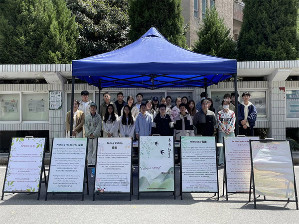 为增进国际文明对话交流、促进文化繁荣发展,经校团委审批、业务指导单位(基础部)指导,英语社于3月27日至3月29日在校园主干道开展了“用英语传播中国特色传统文化”系列活动之第一期活动:“‘Colorful Spring’多彩春季”主题活动。活动设计了以春季为主题的多块双语展板(文字主要来源为China Daily《中国日报》),包含春季六节气、春季农耕活动(采茶)、春季风俗(春游赏景)、春季代表食物(青团)等中国春季特色传统文化相关内容;同时策划了围绕中国特色传统文化的多种小活动,如签名支持、传统文化单词双语卡片互动、传统文化英语口述等,并在活动结束后为社员单独举行了英语社专场活动。