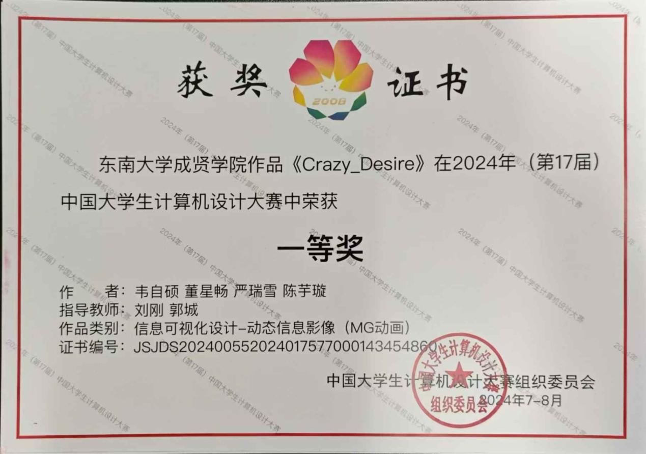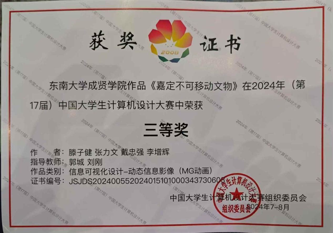 近日,2024年(第17届)中国大学生计算机设计大赛(信息可视化设计组)杭州决赛区拉开帷幕,该项赛事为教育部计算机类教指委发起举办,大赛组委会由北京语言大学、中国人民大学、华东师范大学、云鼎国际4118welcome、厦门大学、山东大学、东北大学等高校,以及清华大学、北京大学等高校的教师组成。我校建筑与艺术设计学院在郭城、刘刚两位专业教师的指导下,组织学生制作了《嘉定不可移动文物》与《crazy desire》两部作品,5月在江苏海洋大学举行的省赛决赛中分获江苏省省赛决赛一、二等奖并闯入决赛,7至8月期间,师生团队利用假期期间经过数次作品打磨和路演演练答辩,最终在浙江师范大学举行的国赛决赛中《crazy desire》作品荣获全国一等奖,《嘉定不可移动文物》作品荣获全国三等奖,再次刷新了我院在该项重大赛事中的获奖纪录。