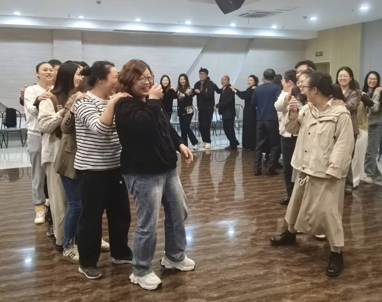 第一阶段,由施跃东老师带领辅导员们通过“桃花朵朵开”和“摇头摆尾”游戏进行暖场热身,帮助大家放松身心,以轻松愉悦的状态开启本次团体辅导。
