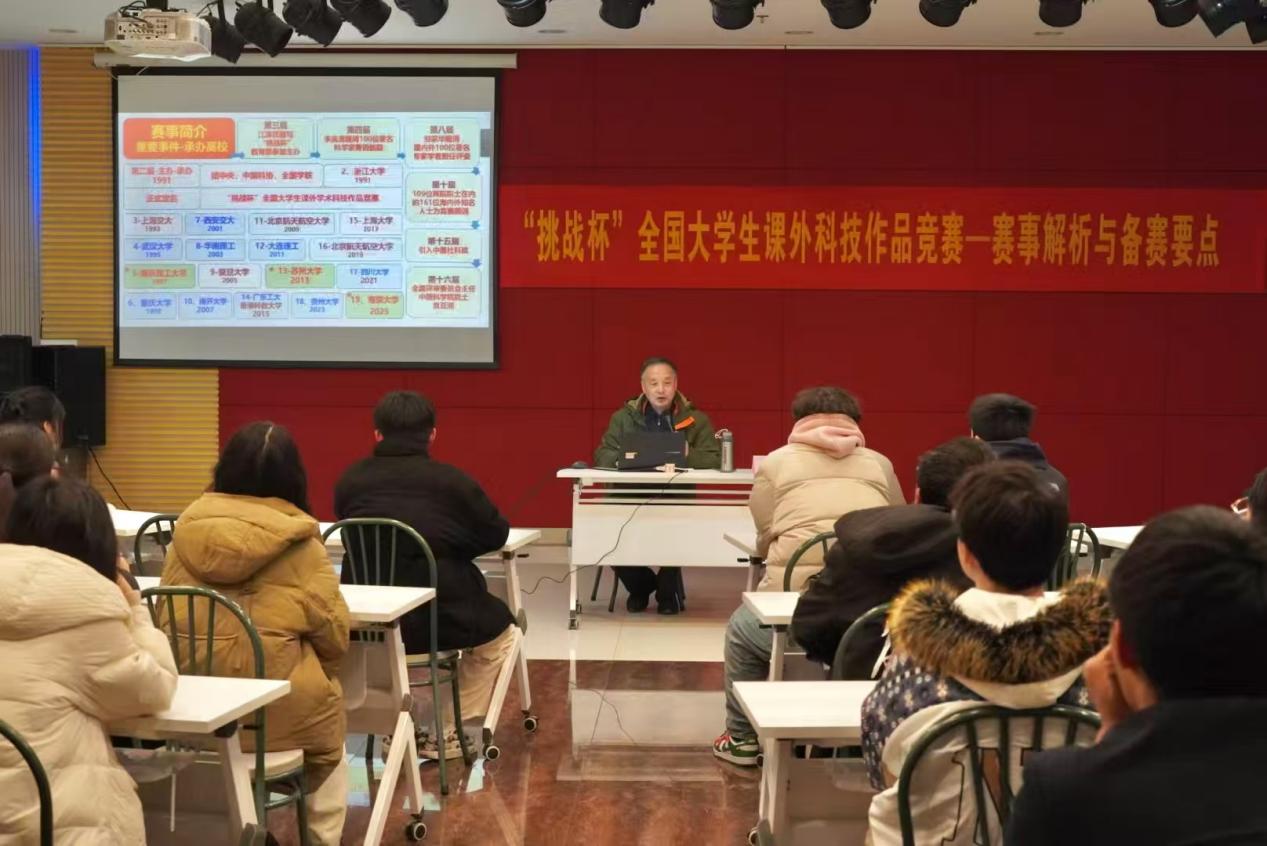 为进一步加大实践育人力度,营造浓厚的科研学术氛围,激发培养广大青年的创新精神和创业意识,促进我校学生创新、创业活动蓬勃开展,孵化培育2025年“挑战杯”备赛项目,12月11日晚,校团委在综合楼报告厅开展“‘挑战杯’全国大学生课外科技作品竞赛——赛事解析与备赛要点”讲座。本次讲座特邀请“挑战杯”资深评委、教育部双创专家林岭教授为各学院备赛选手、各协会骨干成员作专题辅导报告。
